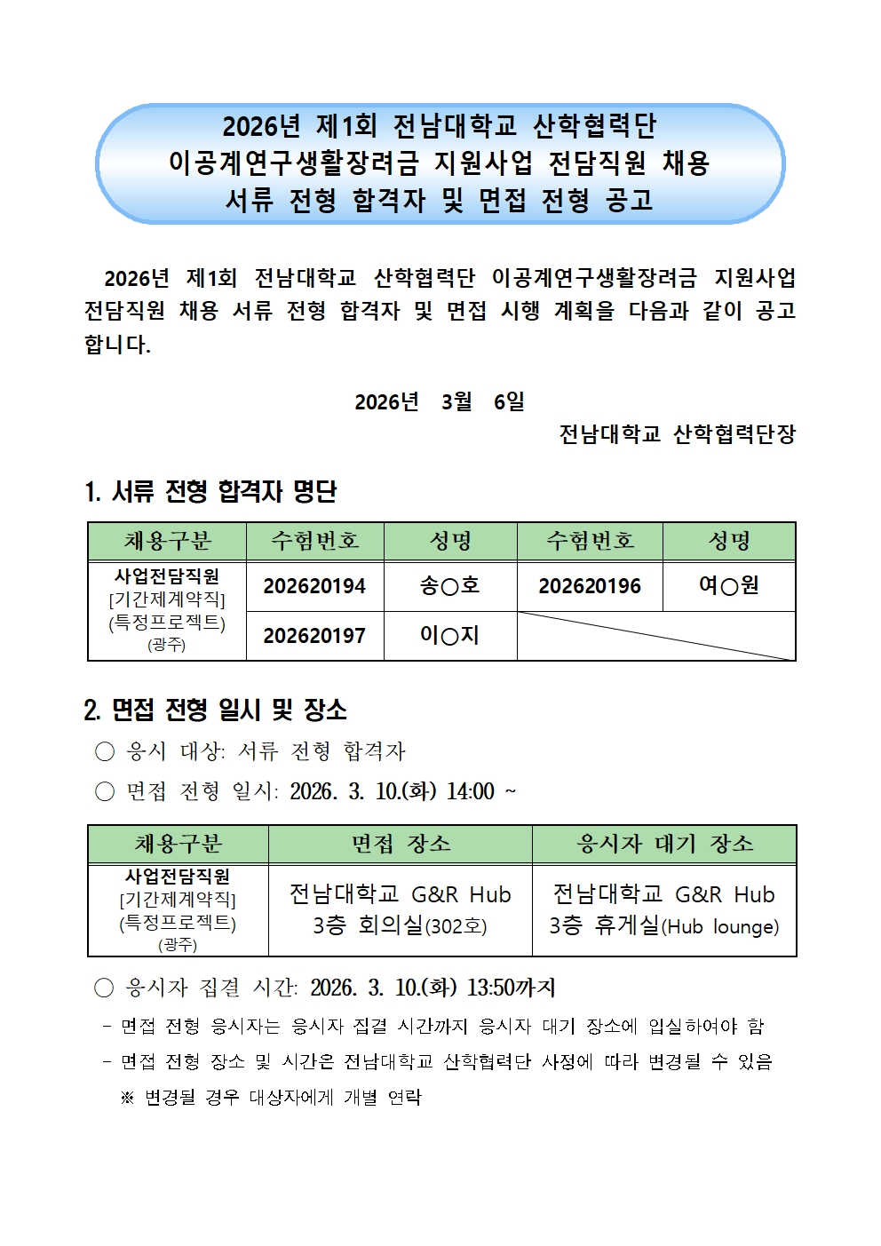 2026년 제1회 전남대학교 산학협력단 이공계연구생활장려금 지원사업 전담직원 채용 서류 전형 합격자 및 면접 전형 공고