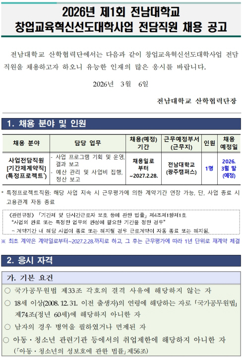 2026년 제1회 전남대학교 창업교육 혁신선도대학 사업 전담직원 채용 공고