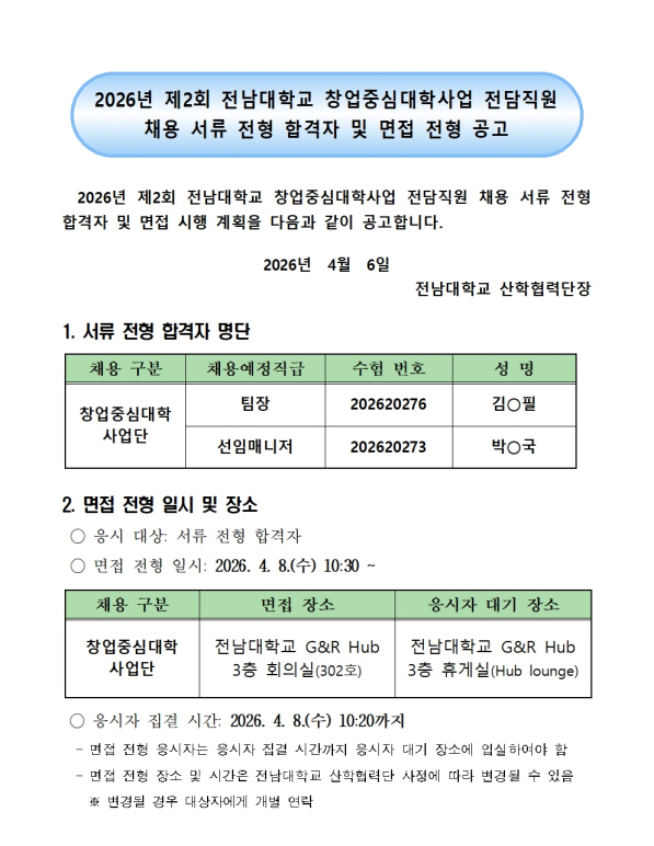 2026년 제2회 전남대학교 창업중심대학사업 전담직원 채용 서류전형 합격자 및 면접전형 공고